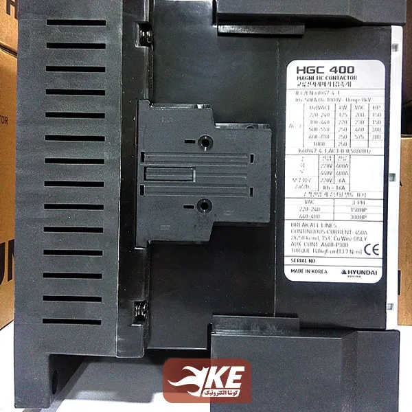 کنتاکتور 400 آمپر 220ولت هیوندای مدل HGC400 ساخت کره و قابلیت راهاندازی موتورسهفاز 400 ولت تا حداکثر 220 کیلووات را دارد، همچنین ولتاژ تحریک بوبین این کنتاکتور 220 ولت AC میباشد. کنتاکتور 400 آمپر هیوندای، یکی از پرمصرفترین و محبوبترین کنتاکتورها در ماشینآلات صنعتی است. ولتاژی که کنتاکتور در شرایط عادی و با جریان نامی «Ie» توانایی قطع و وصل آن را داراست، مانند دیگر برندها برابر 690 ولت است. دیگر مشخصات فنی این کنتاکتور عبارتست از: